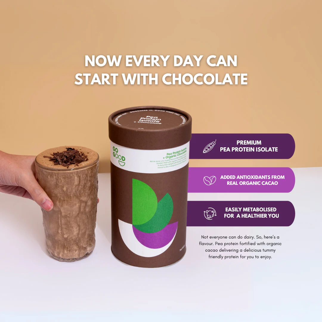 Fuel your day the Go Good way with our Organic Chocolate Plant Protein Isolate, made from high-quality organic plant proteins and real organic cacao. Smooth, satisfying, and easy to digest this is clean, complete plant protein designed for strength, recovery, and everyday wellbeing.